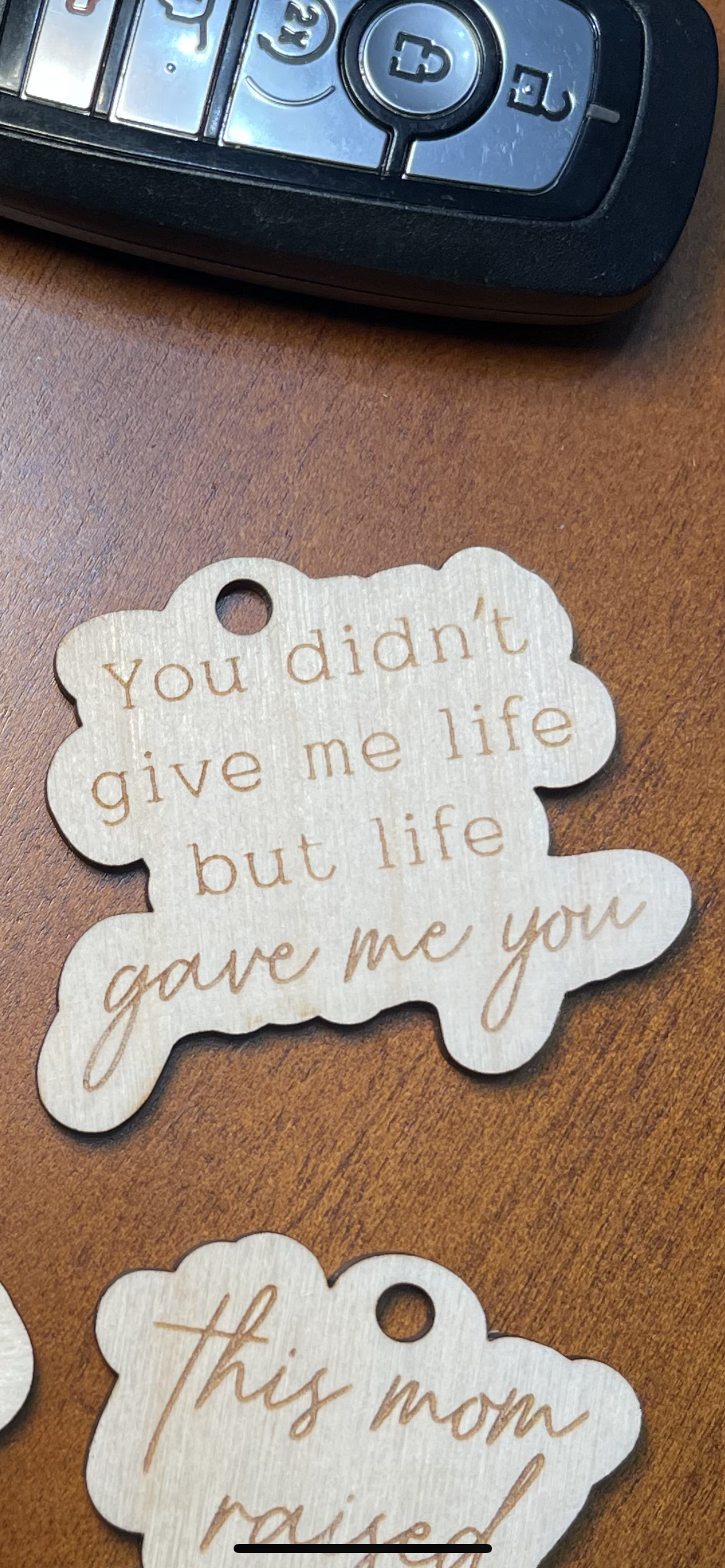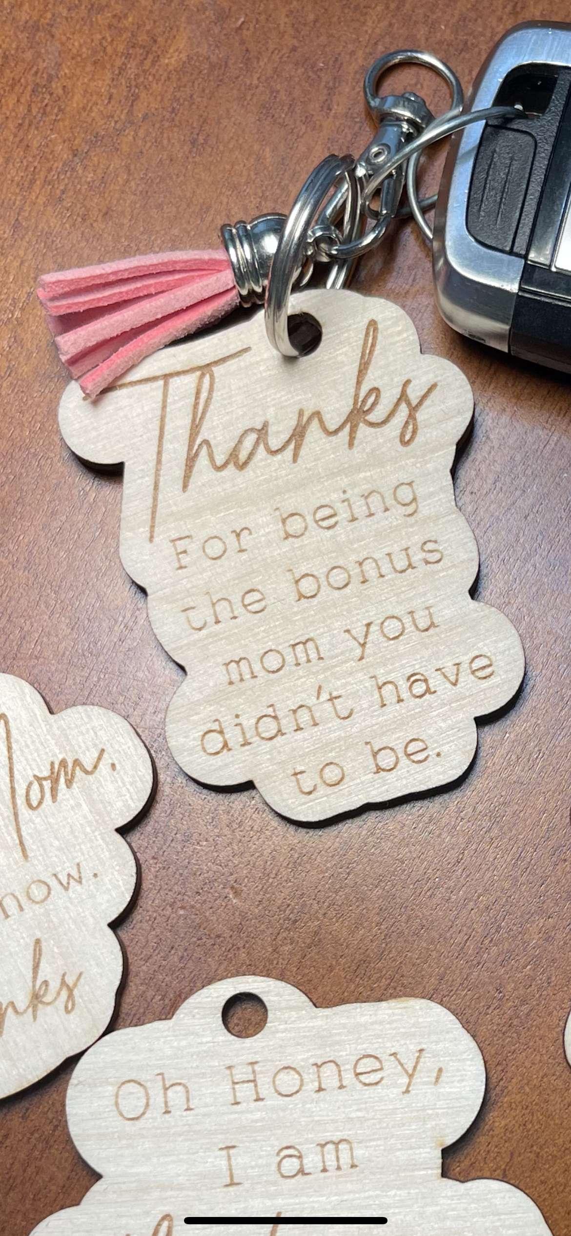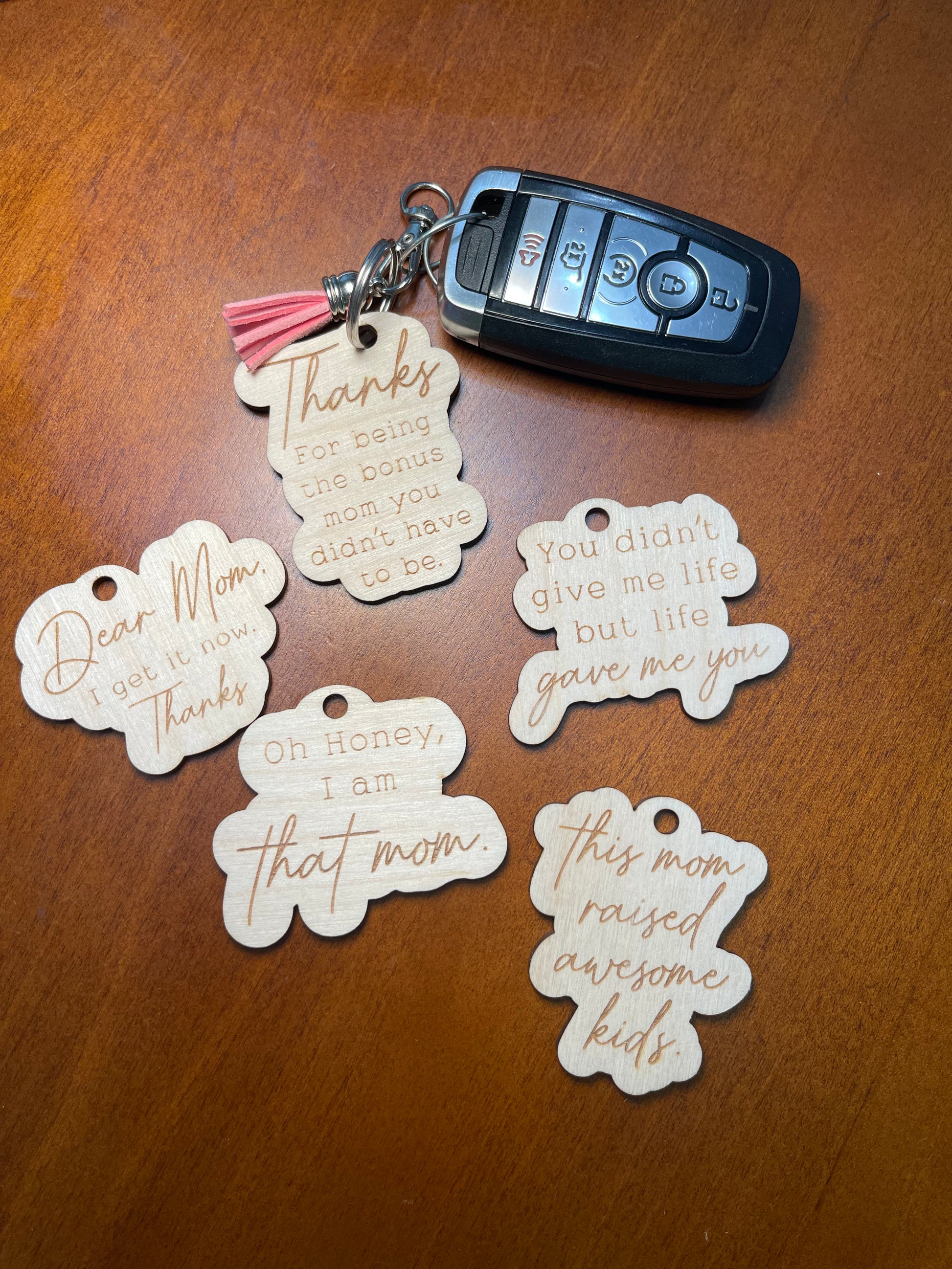 Keychains with "mom sayings" that can also be used as car charms feature a loop that can be easily attached to a set of keys, purse, or backpack, but they can also be hung from the rearview mirror of a car to add a touch of personality and style to the vehicle.