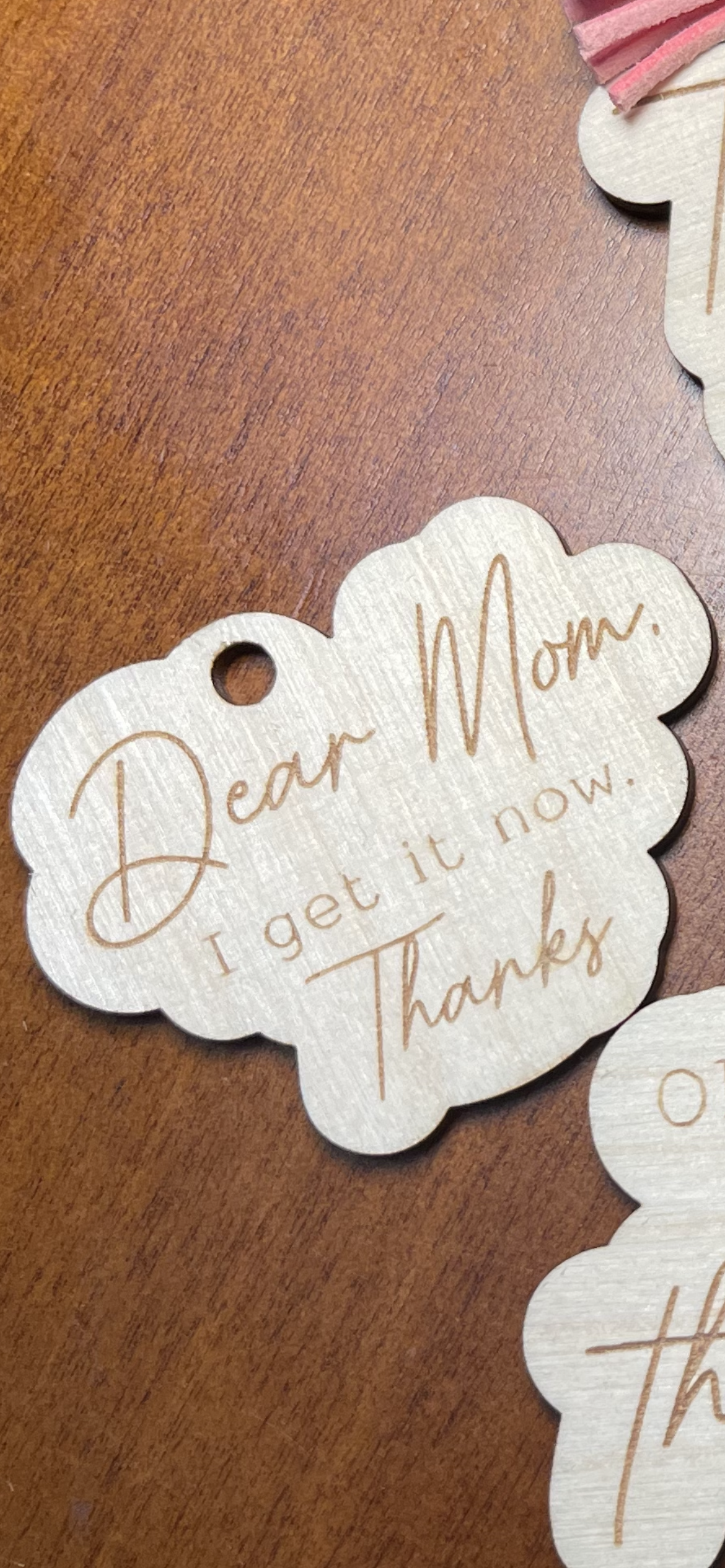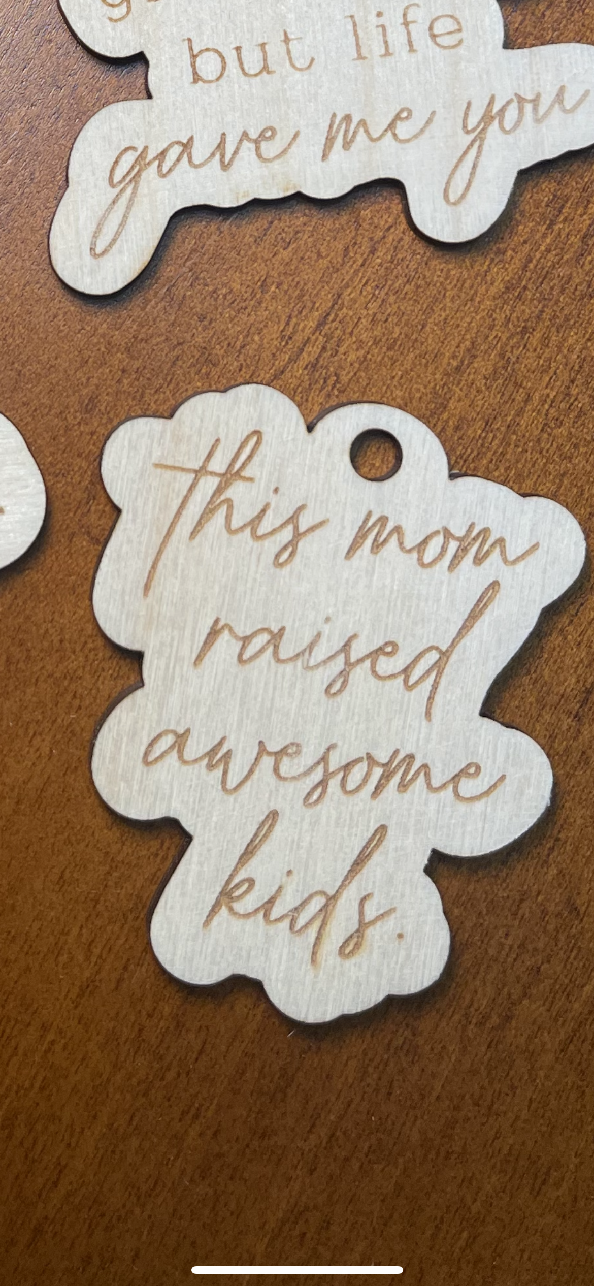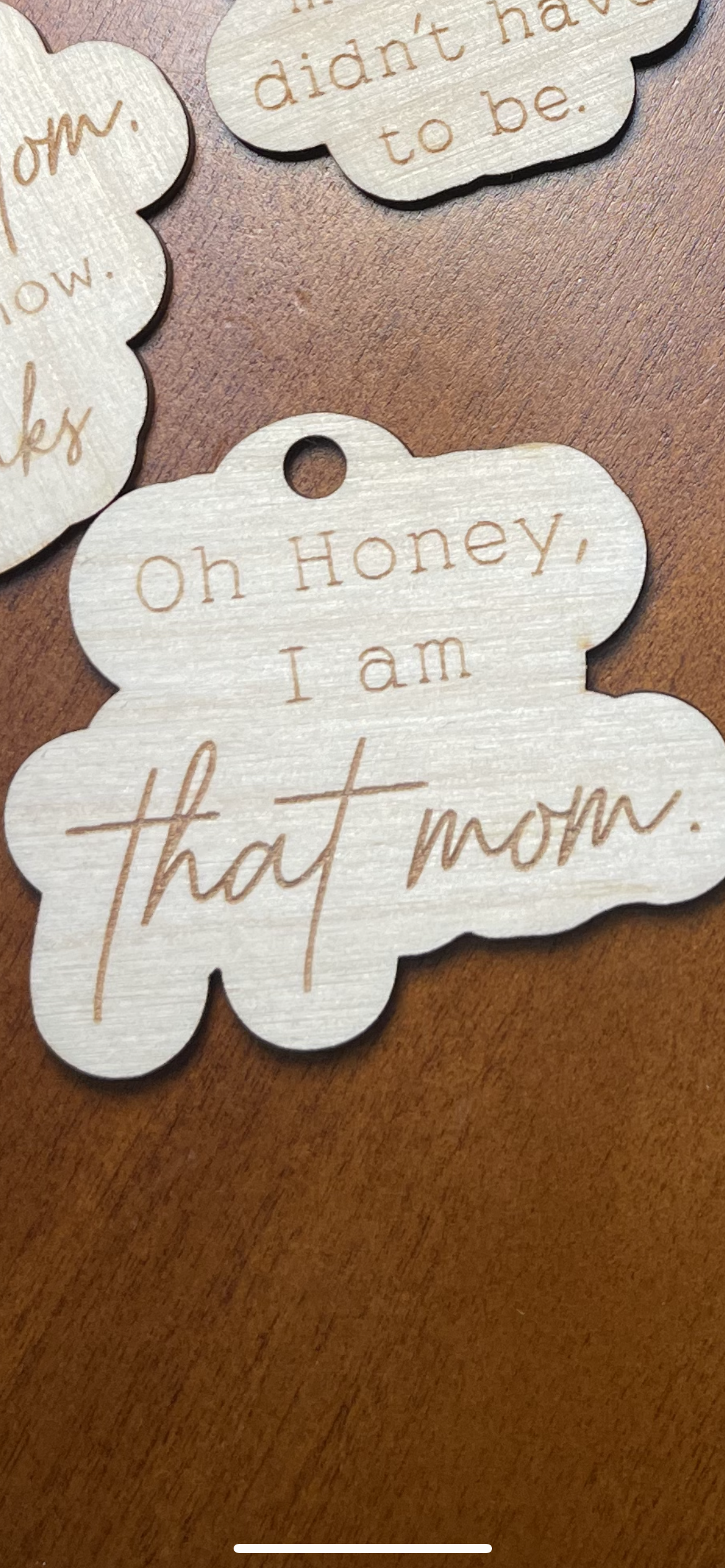 Keychains with "mom sayings" that can also be used as car charms feature a loop that can be easily attached to a set of keys, purse, or backpack, but they can also be hung from the rearview mirror of a car to add a touch of personality and style to the vehicle.