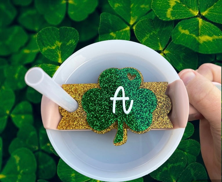 This topper is laser cut on 1/8" glitter green acrylic and adhered to 1/8" glitter gold acrylic for a total thickness of 1/4".
