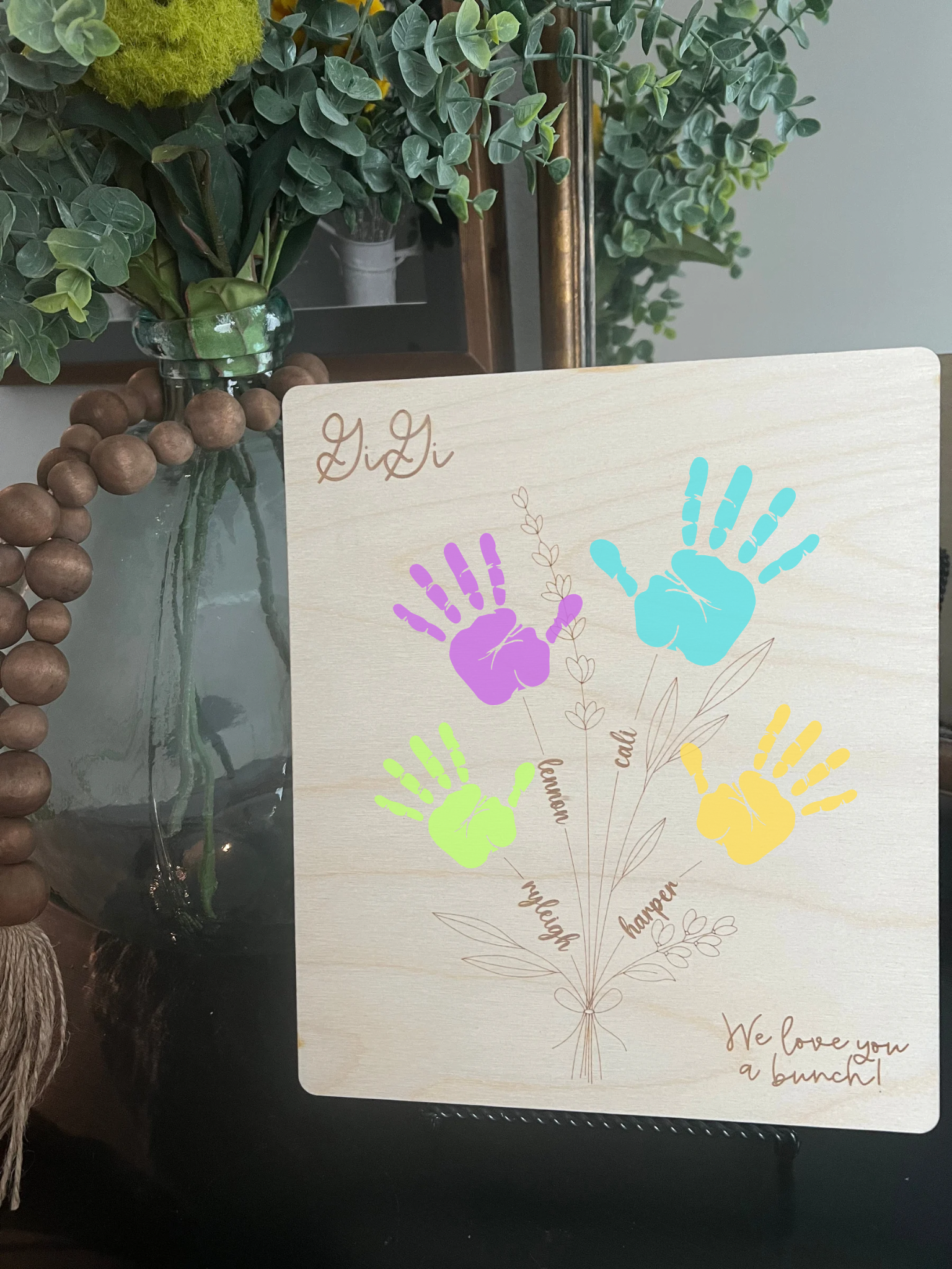 This sign can be personalized with names and handprints, making them a unique and thoughtful gift or keepsake. This product measures 10.5 inches in height and 9 inches in width.