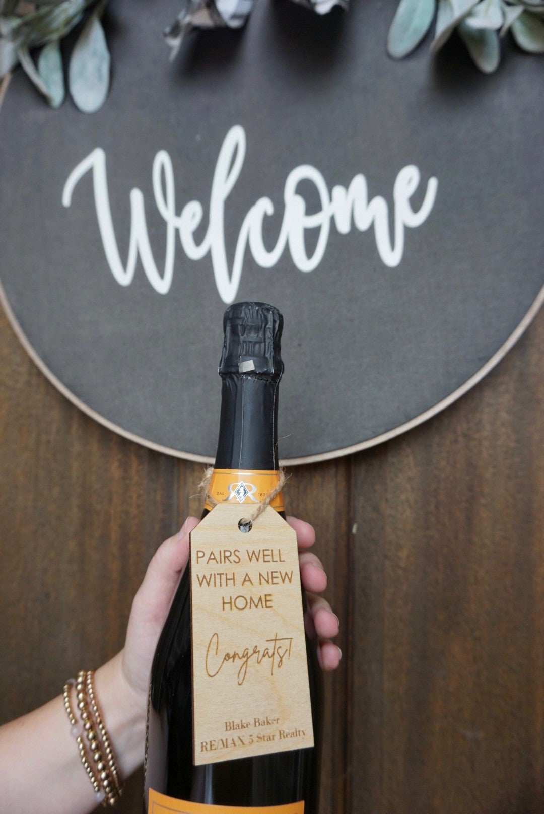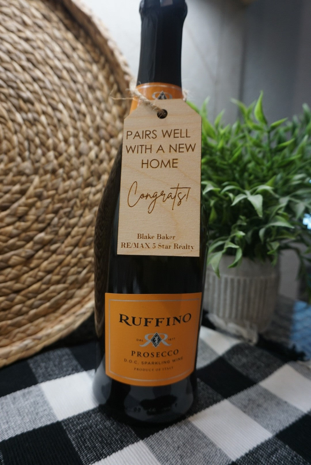 This personalized 2X4 bottle tag is the ideal finishing touch for any special gift-giving occasion! Engraved with your realtor information or logo, it adds a unique, personal touch to any celebratory bottle.