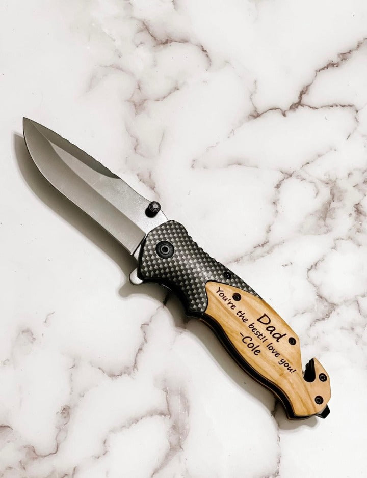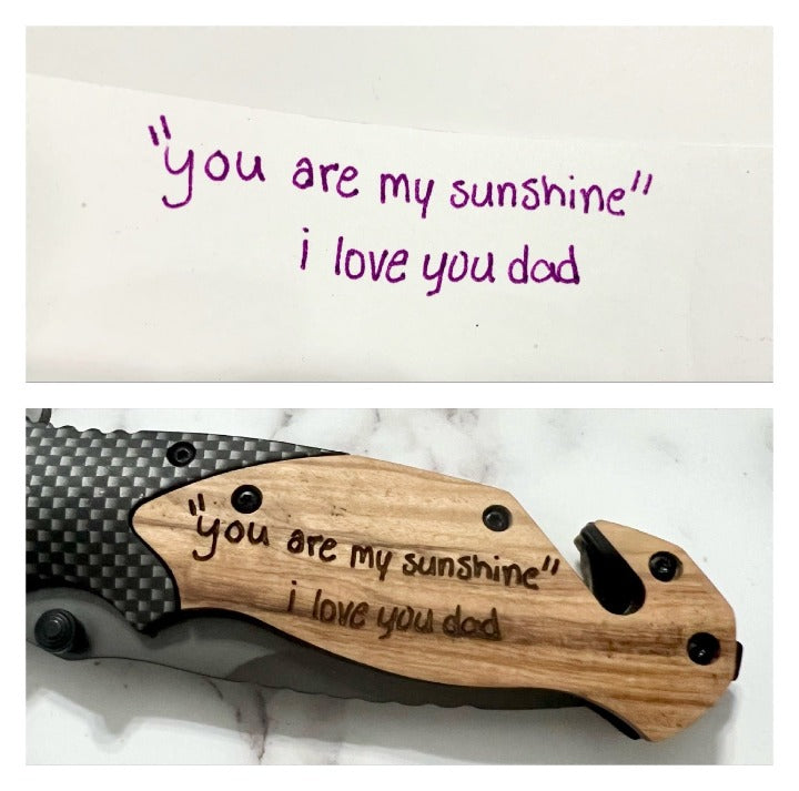 This beautiful Olivewood and Stainless Steel Knife is the perfect way to customize a special saying or upload your personal handwriting. The handle is made of Olivewood that has been carefully selected for its strength and durability, while the blade is made of high-quality stainless steel that is designed to stay sharp for years of use. Make a lasting impression with this beautiful and unique knife.