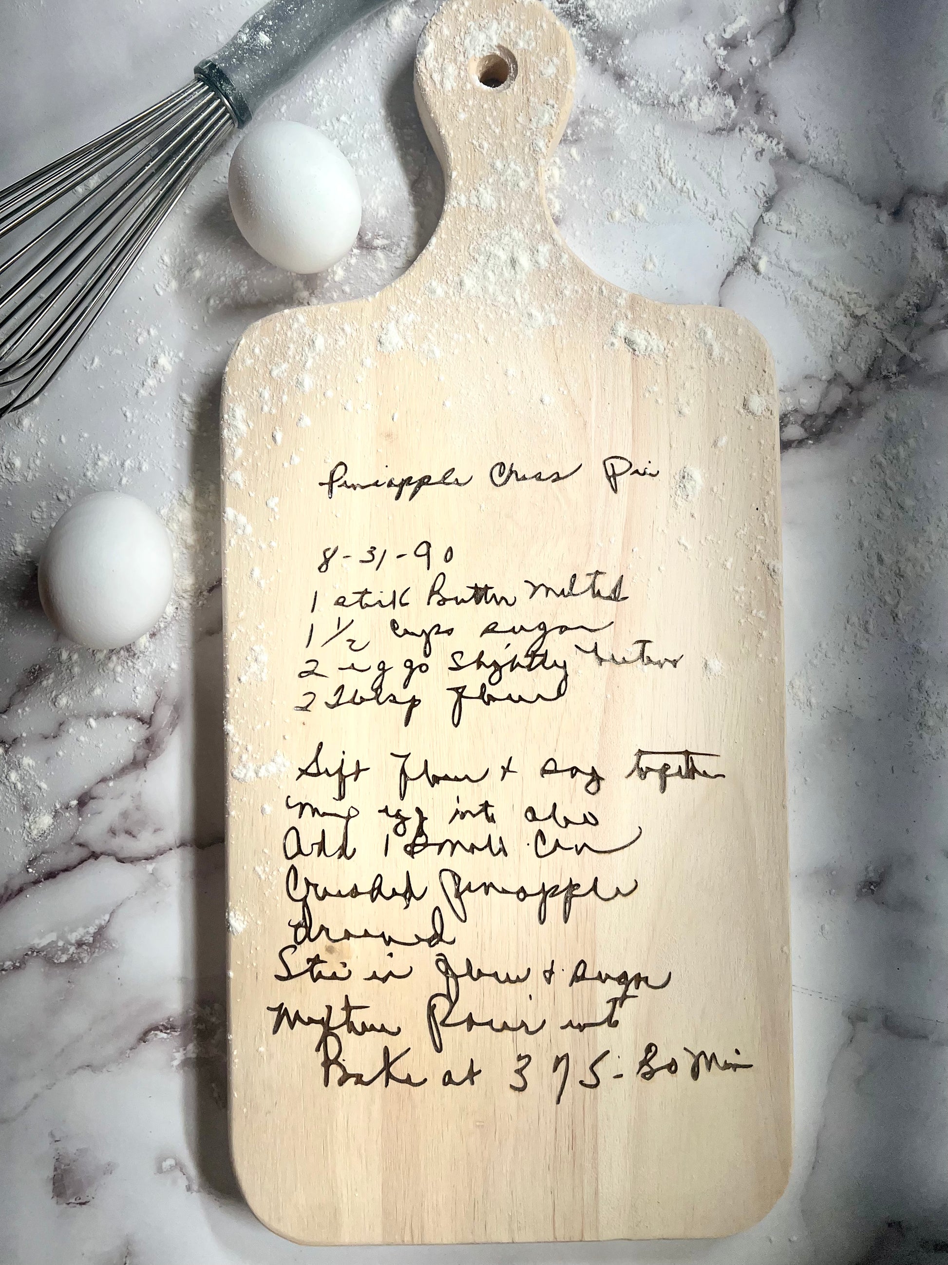 This beautiful wooden cutting board is the perfect way to preserve cherished handwritten recipes, and make them into a treasured gift. The cutting board measures 18"x 8"x 3/4", and comes with a handle for easy carrying. Each board is unique, and will have slight variations, making it a truly special gift.
